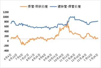1月國內焊管、鍍鋅管價格先跌后穩。據云商平臺監測數據顯示,截至1月26日,全國4寸(3.75)國標焊管平均價格5331元,比上月同期下跌208元,全國4寸(3.75)鍍鋅管平均價格6286元,比上月同期下跌185元;全國50*50*2.5方管平均價格5268元,比上月同期下跌72元;全國219*6螺旋管平均價格5565元,比上月同期下跌202元。月中下旬焊鍍管市場反彈力度弱于上游(見圖1)。