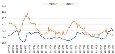 1月份金融數據顯示,當月社會融資規模及人民幣貸款增量均同比大幅多增,好于市場預期;廣義貨幣(M2)增速繼續回升,狹義貨幣(M1)增速回落。從長期趨勢看,工業生產者出廠價格(PPI)與M1走勢呈現正相關關系,M1領先于PPI,傳導時間一般一年左右。