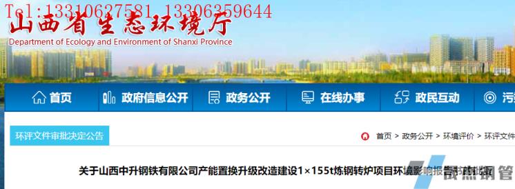 你公司《關于<山西中升鋼鐵有限公司產能置換升級改造建設1×155t煉鋼轉爐項目環境影響報告書>報批的申請》(中升申字〔2021〕72號)、省生態環境保護服務中心《關于山西中升鋼鐵有限公司產能置換升級改造建設1×155t煉鋼轉爐項目環境影響報告書的評估報告》(晉環服務評估函〔2021〕151號)及相關材料收悉。經研究,現批復如下: