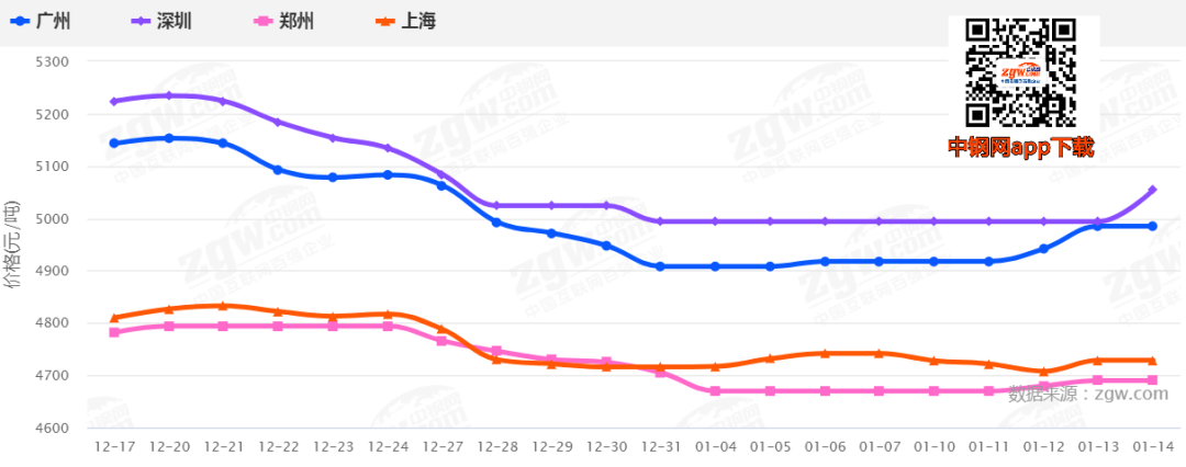 截至1月14日,全國237家流通商周均成交量11.92萬噸,周均成交量環比減少2.84萬噸,減幅為19.24%。據不完全統計,40家電弧爐獨立建筑鋼材生產的鋼廠中,已有25家停產,占62.5%。其中,1月1日前停產的鋼廠占24%,而1月1日至1月10日停產的鋼廠占60%,處于鋼廠集中停產階段。根據市場收集的信息來看,獨立電弧爐建筑鋼材鋼廠平均成本4817元/噸,周環比上升93元/噸。當前電弧爐鋼廠虧損嚴重,尤其是飽和生產的情況下,噸鋼虧損超百元。
