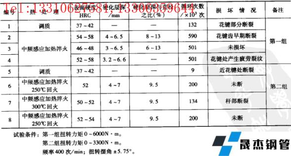 數據表明,感應回火的疲勞壽命較爐中回火為高。其原因是,感應快速加熱時,最表層首先瞬時產生馬氏體分解,使體積收縮處于相變超塑性階段,待整體回火完成后表層形成更大的壓應力,具有一個更理想的有利于提高疲勞強度的應力分布;而爐內加熱緩慢沒有這種條件。(3)半軸感應加熱表面淬火舉例,40MnB鋼制造的帶法蘭半軸的表面淬火工藝技術要求見表8 ,其淬火工藝可以采用連續加熱淬火和整體一次加熱淬火,工藝參數見表9 和表10 。▼表840MnB鋼半軸表面感應淬火技術要求