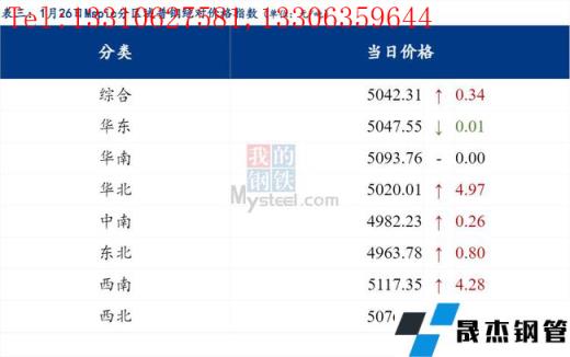 1月26日Myspic普鋼絕對價格指數變化:綜合指數5042.31,上漲0.34;螺紋鋼指數4821.4,上漲0.53;線材指數5153.66,上漲1.46;熱軋板卷指數4901.08,上漲1.51;冷軋板卷指數5401.75,上漲1.84;中厚板指數5041.64,上漲1.35。