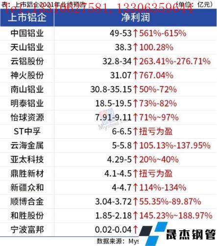 免責聲明:本網站(山東聊城晟杰無縫鋼管廠m.gdqiayu.com)刊載的“15家上市鋁企2021年業績飄紅,神火股份大增超7倍”等均源于網絡,版權歸原作者所有,且僅代表原作者觀點,本文所載信息僅供參考。轉載僅為學習與交流之目的,如無意中侵犯您的合法權益,請及時聯系刪除。本網站刊登此篇文章并不意味著本站贊同其觀點或證實其內容的真實性,我們不對其科學性、嚴肅性等作任何形式的保證。如果侵犯了您的版權,請盡快聯系我們予以撤銷,謝謝合作!