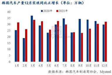 2021年11月日本汽車產量76萬輛,環比增長47%,截至2021年11月,日本汽車產量同比降幅連續三個月收窄;韓國2021年12月汽車產量32萬輛,環比增長5%,同比增長7%,是近四個月首次實現同比增長。