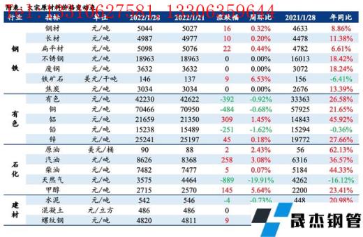 免責聲明:本網站(山東聊城晟杰無縫鋼管廠m.gdqiayu.com)刊載的“大宗原材料價格周報(1.24-1.28)”等均源于網絡,版權歸原作者所有,且僅代表原作者觀點,本文所載信息僅供參考。轉載僅為學習與交流之目的,如無意中侵犯您的合法權益,請及時聯系刪除。本網站刊登此篇文章并不意味著本站贊同其觀點或證實其內容的真實性,我們不對其科學性、嚴肅性等作任何形式的保證。如果侵犯了您的版權,請盡快聯系我們予以撤銷,謝謝合作!
