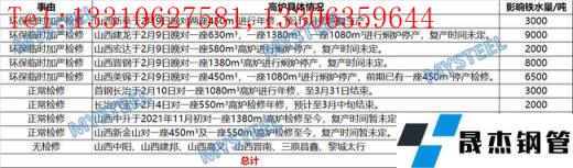 我網前兩日發布消息“河南、山東及河北唐山地區部分無縫厚壁鋼管廠家接到臨時限產加嚴通知。會在原有限產基礎上燒結全停,個別無縫厚壁鋼管廠家有新增高爐檢修,2月8日下午18點開始執行,預計11日解除?!睂Υ?,我網進行了進一步調研,山西部分區域也受之影響進行燜爐,具體情況如下: