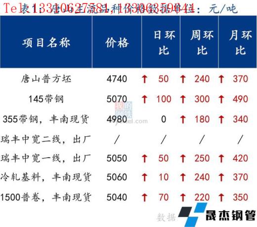 145帶鋼出廠5070元/噸,較昨日漲100元/噸。355帶鋼市場現貨價格4980元/噸,較昨日持平。焊管價格5240元/噸,鍍鋅管價格5850元/噸,較昨日持平。