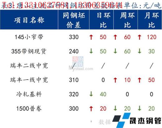 145帶鋼與鋼坯價差拉大,小窄帶漲幅高于鋼坯上漲速度,調坯軋材廠仍在停產。焊管與355帶鋼價差較昨日持平,熱卷與帶鋼價差擴大,卷帶差修復。