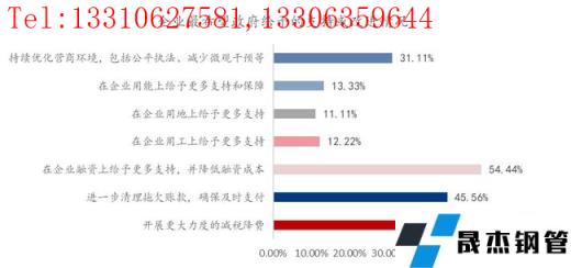 從圖32上看,希望開展更大力度的減稅降費支持的占比為67.78%;進一步清理拖欠賬款,確保及時支付的占比為45.56%;在企業融資上給予更多支持,并降低融資成本的占比為54.44%;在企業用工上給予更多支持的占比為12.22%;在企業用地上給予更多支持的占比為11.11%;在企業用能上給予更多支持和保障的占比為13.33%;持續優化營商環境,包括公平執法、減少微觀干預等的占比為31.11%。