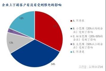 關于企業的上下游客戶有沒有受到限電的影響,參與調研企業中表示不存在占比32.37%,小范圍(20%以內的企業)受到了影響占比34.15%,相當范圍(20%-50%的企業)受到了影響占比12.42%,大范圍(50%以上的企業)受到了影響占比2.66%,不清楚占比18.40%??梢娺€是有相當一部分企業受到了限電影響。