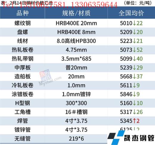 2月14日,國內厚壁無縫鋼管市場價格下跌,唐山普方坯出廠價穩報4700元/噸。近期,包括國家發改委、市場監管總局、中鋼協在內的多部門和機構都提出,要加強市場監管、確保鐵礦石市場平穩運行。近日鐵礦石、厚壁無縫鋼管期貨市場沖高回落,鋼價跟隨調整。