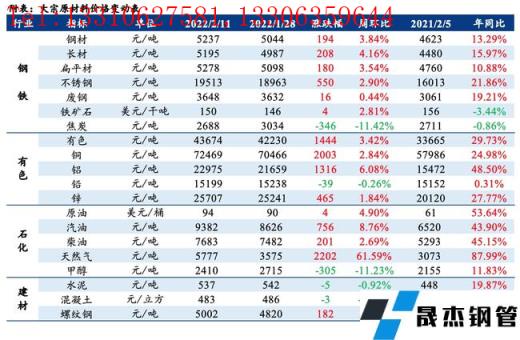 免責聲明:本網站(山東聊城晟杰無縫鋼管廠m.gdqiayu.com)刊載的“周報:大宗原材料價格周報(2.07-2.11)”等均源于網絡,版權歸原作者所有,且僅代表原作者觀點,本文所載信息僅供參考。轉載僅為學習與交流之目的,如無意中侵犯您的合法權益,請及時聯系刪除。本網站刊登此篇文章并不意味著本站贊同其觀點或證實其內容的真實性,我們不對其科學性、嚴肅性等作任何形式的保證。如果侵犯了您的版權,請盡快聯系我們予以撤銷,謝謝合作!