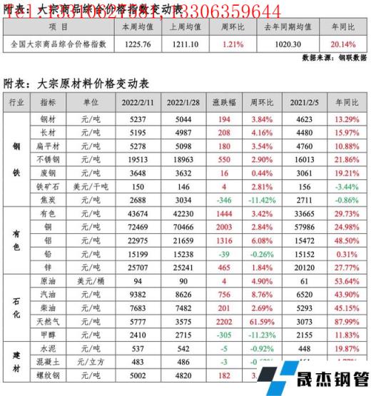 免責聲明:本網站(山東聊城晟杰無縫鋼管廠m.gdqiayu.com)刊載的“MRI:大宗原材料價格周報(2月7日-2月11日)”等均源于網絡,版權歸原作者所有,且僅代表原作者觀點,本文所載信息僅供參考。轉載僅為學習與交流之目的,如無意中侵犯您的合法權益,請及時聯系刪除。本網站刊登此篇文章并不意味著本站贊同其觀點或證實其內容的真實性,我們不對其科學性、嚴肅性等作任何形式的保證。如果侵犯了您的版權,請盡快聯系我們予以撤銷,謝謝合作!