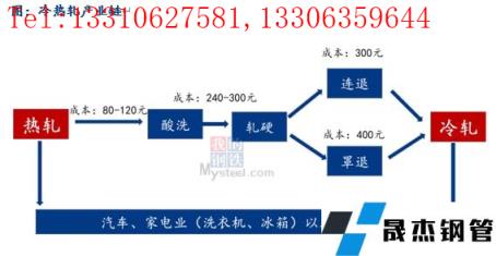由于熱軋是冷軋的原料,調研了解有近40%的熱軋被用來生產冷軋,而且冷熱軋終端需求分布有部分重合,因此冷軋與熱軋價格走勢高度類似。冷軋板卷是以熱軋卷為原料,在室溫下經過酸洗(費用80-120元/噸)、軋制(費用240-300元/噸),然后連退(費用300元/噸)或罩退(費用400元/噸)而成,冷軋成本較熱軋多出620-820元/噸。從下游需求分布來看,冷熱軋終端需求分布有部分重合,冷熱軋均被用于汽車、家電業(洗衣機、冰箱)以及產業設備等。