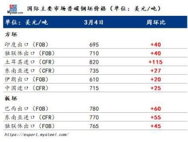 此外,本周印度多家無縫厚壁鋼管廠家再次進行方坯出口招標。據了解,印度Vizag公司對3萬噸方坯(150x150mm, 3SP/4SP)出口招標,目前接到的投標價格高達720美元/噸FOB,印度國內方坯價格也隨著成本上漲而上漲,獨聯體資源供應中斷也提振了印度方坯價格。