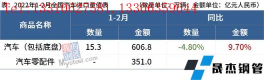 免責聲明:本網站(山東聊城晟杰無縫鋼管廠m.gdqiayu.com)刊載的“海關總署:1-2月中國出口汽車47.7萬輛,同比增99.10%”等均源于網絡,版權歸原作者所有,且僅代表原作者觀點,本文所載信息僅供參考。轉載僅為學習與交流之目的,如無意中侵犯您的合法權益,請及時聯系刪除。本網站刊登此篇文章并不意味著本站贊同其觀點或證實其內容的真實性,我們不對其科學性、嚴肅性等作任何形式的保證。如果侵犯了您的版權,請盡快聯系我們予以撤銷,謝謝合作!