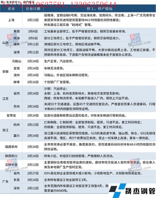 近期,全國疫情呈現局部高度聚集和多點散發態勢,對國內大宗商品市場的供應端、需求端、物流及倉儲等方面都有不同程度的影響。據統計,截至3月15日,全國多個省市發布停工停產情況。其中受疫情影響最大的吉林省于3月12日宣布,長春市主要厚壁無縫鋼管倉庫暫停出庫,當地建材市場交投進入暫時停滯狀態,倉庫入庫及本地無縫厚壁鋼管廠家生產暫時正常。深圳市于3月12日宣布,全市范圍內所有建設工地暫定停工排查4天,南山及福田區域厚壁無縫鋼管市場預計共影響需求量約6640噸。與此同時,全國其他地區鋼貿交易也受到影響,部分工地開始停工,物流運輸暫停服務。具體情況如下: