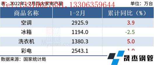 免責聲明:本網站(山東聊城晟杰無縫鋼管廠m.gdqiayu.com)刊載的“統計局:1-2月中國四大家電產量3增1降”等均源于網絡,版權歸原作者所有,且僅代表原作者觀點,本文所載信息僅供參考。轉載僅為學習與交流之目的,如無意中侵犯您的合法權益,請及時聯系刪除。本網站刊登此篇文章并不意味著本站贊同其觀點或證實其內容的真實性,我們不對其科學性、嚴肅性等作任何形式的保證。如果侵犯了您的版權,請盡快聯系我們予以撤銷,謝謝合作!