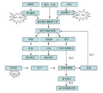 富錳渣生產線整個工藝系統由原材料入廠、儲存、電子稱稱量、皮帶輸送機上料、布料小車布料、高爐還原冶煉、鐵水包,成品入庫及成品發放等組成。在生產過程中排出大量的高溫含塵煙氣,煙氣主要成份是煤氣,所產生的煙塵是要是爐塵和瓦斯泥。
