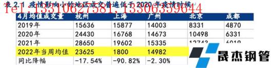 自3月中旬以來,受上海、江蘇、山東等地疫情封控影響,下游工地施工節奏大幅放緩。華東地區螺紋鋼表觀消費量3月中旬為156萬噸/周,4月中旬僅119萬噸/周,下降了23%。若長三角疫情在5月上旬得到控制,復工復產逐步有序恢復。我們根據歷史經驗和今年的需求特點,推演認為螺紋周均表需(鋼聯口徑)有望達到340-350萬噸/周。而其他受疫情影響較小的地區,社庫去庫速率緩慢,成交低于2020年同期,實際厚壁無縫鋼管需求不容樂觀,疫情結束后這些地區為需求帶來的增量有限。