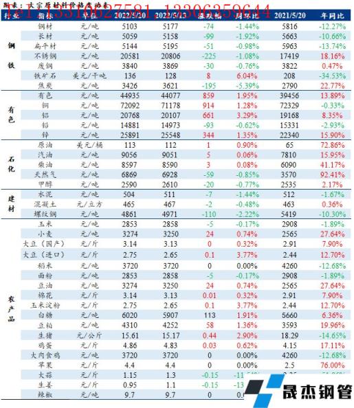 免責聲明:本網站(山東聊城晟杰無縫鋼管廠m.gdqiayu.com)刊載的“周報:大宗工業原材料、能源及農產品價格周報(5.16-5.20)”等均源于網絡,版權歸原作者所有,且僅代表原作者觀點,本文所載信息僅供參考。轉載僅為學習與交流之目的,如無意中侵犯您的合法權益,請及時聯系刪除。本網站刊登此篇文章并不意味著本站贊同其觀點或證實其內容的真實性,我們不對其科學性、嚴肅性等作任何形式的保證。如果侵犯了您的版權,請盡快聯系我們予以撤銷,謝謝合作!