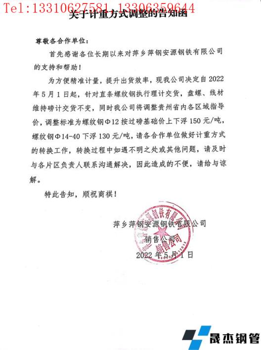 免責聲明:本網站(山東聊城晟杰無縫鋼管廠m.gdqiayu.com)刊載的“萍鄉萍鋼安源鋼鐵有限公司關于對貴州區域計重方式調整的告知函”等均源于網絡,版權歸原作者所有,且僅代表原作者觀點,本文所載信息僅供參考。轉載僅為學習與交流之目的,如無意中侵犯您的合法權益,請及時聯系刪除。本網站刊登此篇文章并不意味著本站贊同其觀點或證實其內容的真實性,我們不對其科學性、嚴肅性等作任何形式的保證。如果侵犯了您的版權,請盡快聯系我們予以撤銷,謝謝合作!