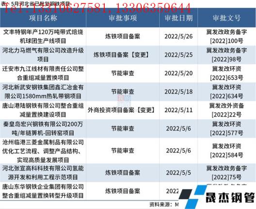 據不完全統計,2022年5月河北省共批復鋼鐵相關項目9個。其中,有4個煉鐵項目備案(變更),4個鋼鐵項目節能審查和1個外商投資項目備案(變更)。
