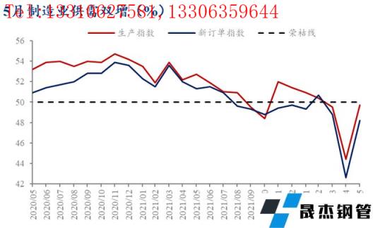 二、5月制造業PMI指數呈供需雙增的態勢,需求回升力度大于供給,大體符合前期判斷。4月筆者發布的文章《4月制造業PMI指數低迷,未來厚壁無縫鋼管消費何去何從?》中便提到,隨著我國經濟逐步復蘇,需求復蘇的彈性將快于供給端。從數據來看,5月新訂單指數大幅回升5.6個百分點至48.2%,回升幅度高于生產指數。據國家統計局數據,5月專用設備、汽車等行業生產指數較上月大幅上升10個百分點以上,升至擴張區間;石油煤炭及其他燃料加工、化學原料及化學制品、黑色金屬冶煉及壓延加工等行業新訂單指數重回擴張區間。