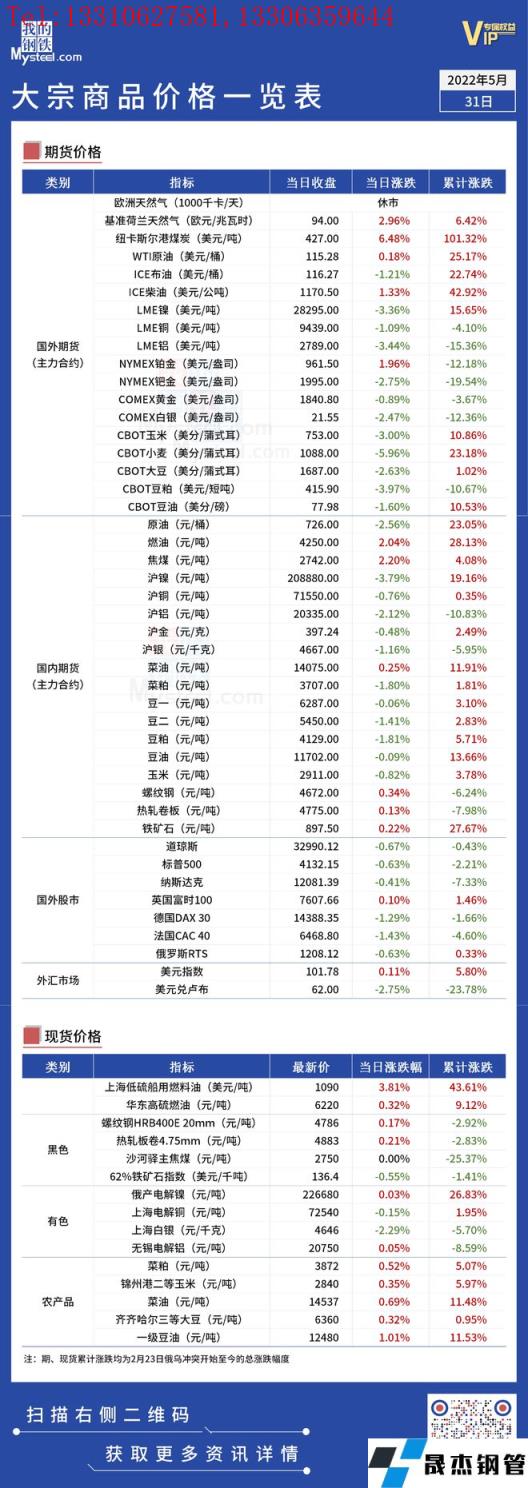 免責聲明:本網站(山東聊城晟杰無縫鋼管廠m.gdqiayu.com)刊載的“俄烏局勢丨大宗商品價格一覽表(5月31日)”等均源于網絡,版權歸原作者所有,且僅代表原作者觀點,本文所載信息僅供參考。轉載僅為學習與交流之目的,如無意中侵犯您的合法權益,請及時聯系刪除。本網站刊登此篇文章并不意味著本站贊同其觀點或證實其內容的真實性,我們不對其科學性、嚴肅性等作任何形式的保證。如果侵犯了您的版權,請盡快聯系我們予以撤銷,謝謝合作!