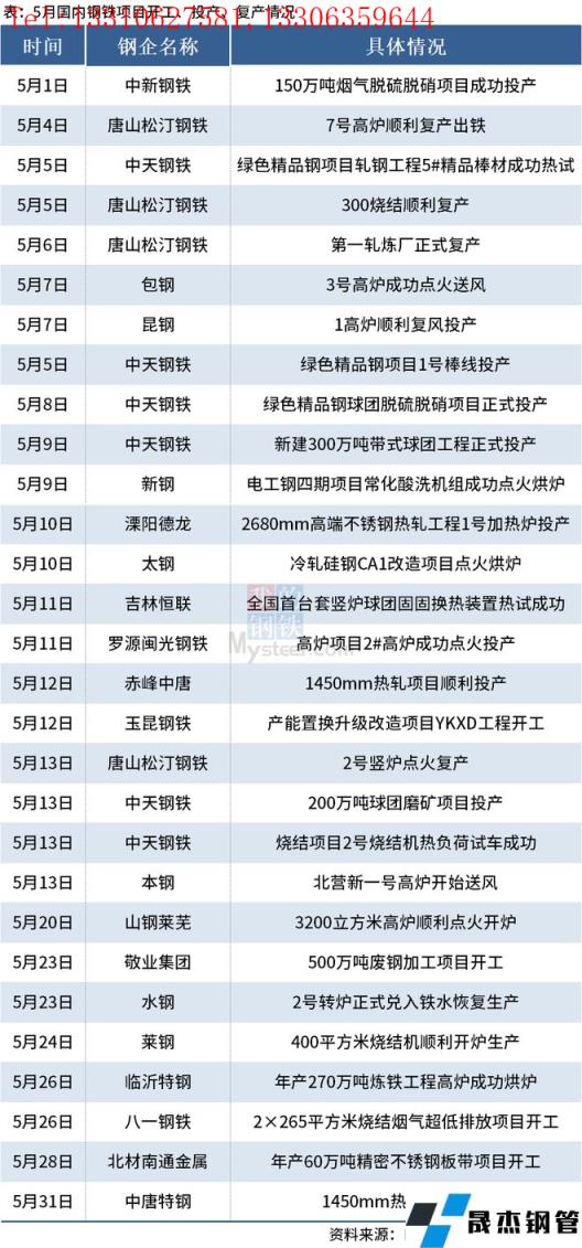 免責聲明:本網站(山東聊城晟杰無縫鋼管廠m.gdqiayu.com)刊載的“5月國內29個鋼鐵項目開工、投產或復產”等均源于網絡,版權歸原作者所有,且僅代表原作者觀點,本文所載信息僅供參考。轉載僅為學習與交流之目的,如無意中侵犯您的合法權益,請及時聯系刪除。本網站刊登此篇文章并不意味著本站贊同其觀點或證實其內容的真實性,我們不對其科學性、嚴肅性等作任何形式的保證。如果侵犯了您的版權,請盡快聯系我們予以撤銷,謝謝合作!