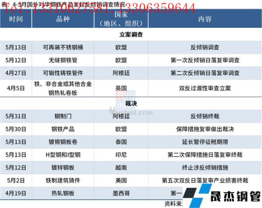 免責聲明:本網站(山東聊城晟杰無縫鋼管廠m.gdqiayu.com)刊載的“4-5月國外對華鋼鐵產品發起反傾銷調查情況”等均源于網絡,版權歸原作者所有,且僅代表原作者觀點,本文所載信息僅供參考。轉載僅為學習與交流之目的,如無意中侵犯您的合法權益,請及時聯系刪除。本網站刊登此篇文章并不意味著本站贊同其觀點或證實其內容的真實性,我們不對其科學性、嚴肅性等作任何形式的保證。如果侵犯了您的版權,請盡快聯系我們予以撤銷,謝謝合作!