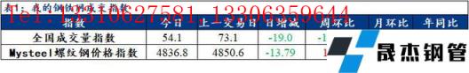 訊:全國建筑厚壁無縫鋼管成交量監測,成交量相對指數來看,全國54.1減19,北方41減14.5,華東68.9減20.6,南方46.4減20。今日螺紋鋼價格指數4836.8,較上一交易日減13.79。