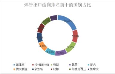 分地區來看,國內厚壁鋼管出口市場主要集中在亞洲地區,5月份在焊管出口量中占比小幅下降至59.05%;亞洲以外國別中美洲出口量占比小幅下降至16.42%。從國別來看,我國焊管的主要流向地區依次為菲律賓、沙特阿拉伯、緬甸、韓國、蒙古、澳大利亞、新加坡、秘魯、印度尼西亞、加拿大。較上月相比,菲律賓繼續排名首位;沙特阿拉伯增長79.50%,蒙古增長56.45%,加拿大增長72.87,相繼進入排名前十,智利下降67.09%跌出排名前十。從出口量排名前十的國別數量來看,亞洲占70%,美洲占20%,澳洲占10%。