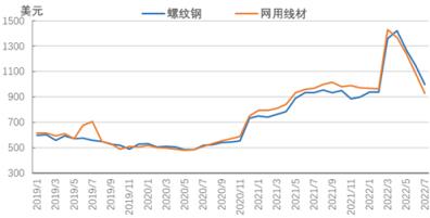 歐洲長材市場價格繼續調整。7月底,歐盟無縫鋼管廠家螺紋鋼價格和網用線材價格分別下跌153美元和160美元,價格在1000美元和930美元;歐盟進口螺紋鋼和網用線材價格分別下跌70美元和120美元。歐洲長材市場價格基本回落至年初水平,目前價格水平約為疫情前的2倍,歐洲經濟衰退壓力加大,長材市場價格仍面臨下行風險,預計8月份歐洲長材市場呈震蕩趨弱的走勢。